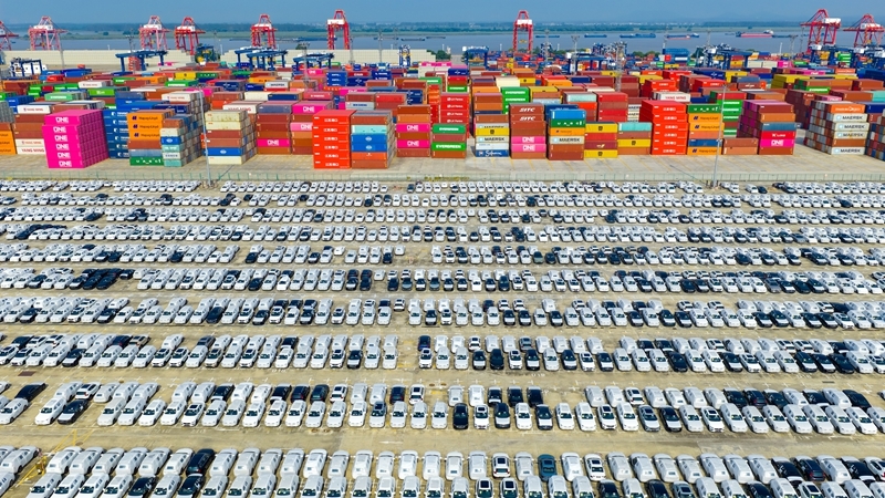 2025年10月4日在江蘇省港口集團南京港龍潭港區拍攝的準備裝船出口的汽車(無人機照片)。新華社發(楊素平?攝)