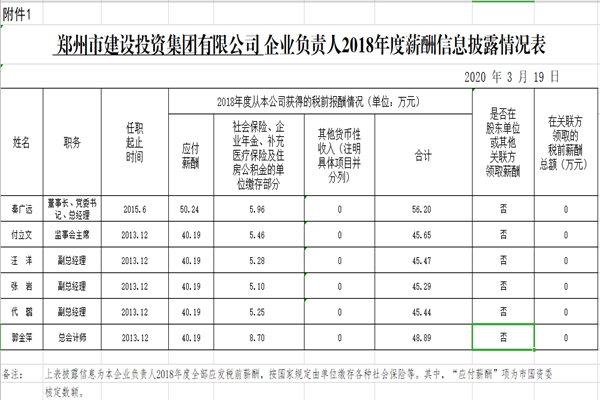 鄭州市建設投資集團有限公司企業負責人2018年度薪酬信息披露情況表